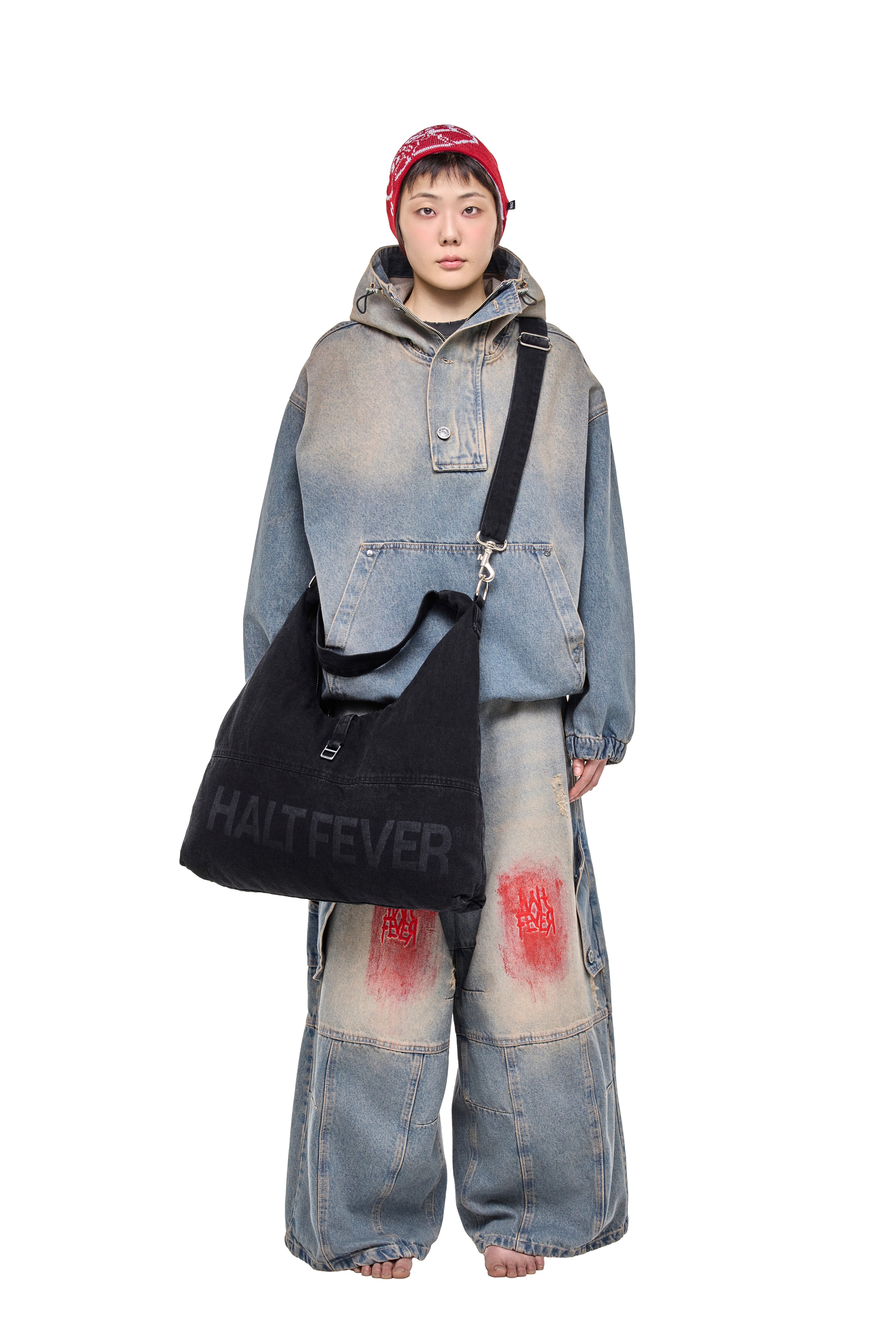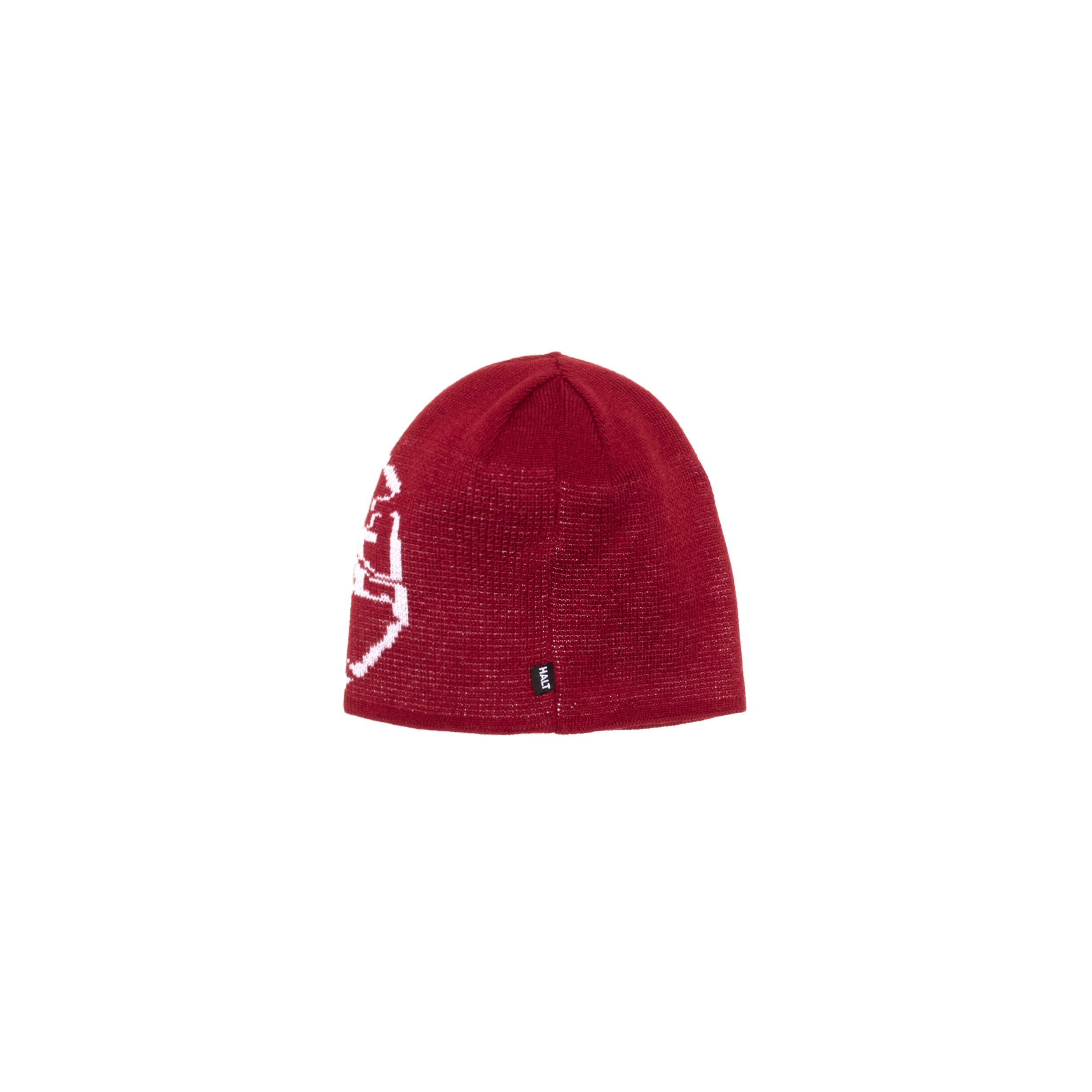 Touca em malharia retilínea de acrílico com ponto canelado 2x2, dupla dobra para ajuste e isolamento. tricô em duas cores (vermelho e branco) formando, no próprio tecido, a silhueta de placa de trânsito “quebrada”; bordado frontal adicional do logo halt em branco para relevo e definição. costura superior embutida e elasticidade calibrada para não afrouxar. conceito: destroços como sinal — fragmentos que ainda orientam.